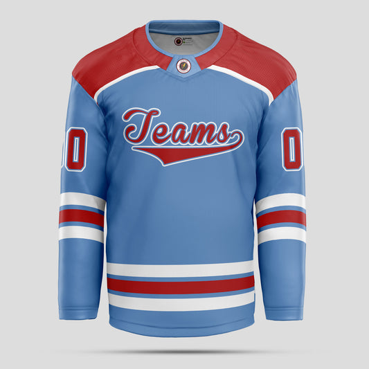 Custom Light Blue, Red, and Gold Hockey Jersey