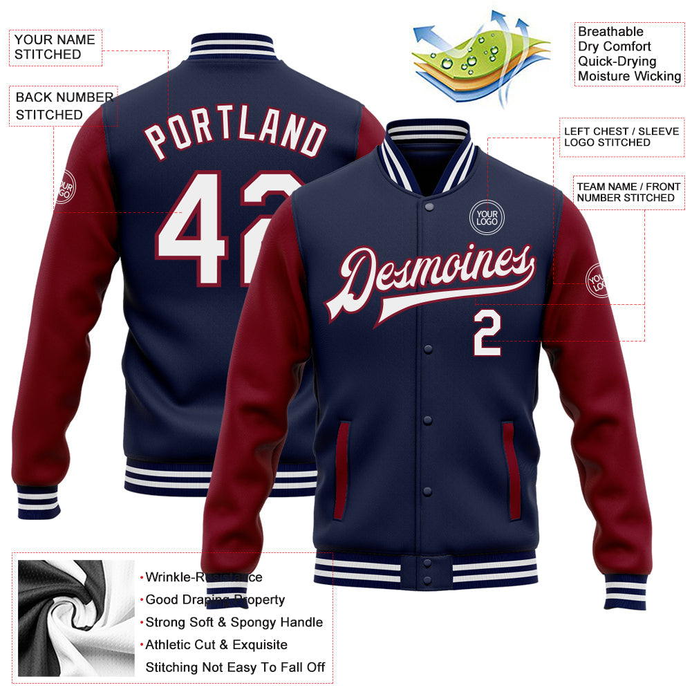 Custom Navy White-Crimson Bomber Full-Snap Varsity Letterman Two Tone Jacket