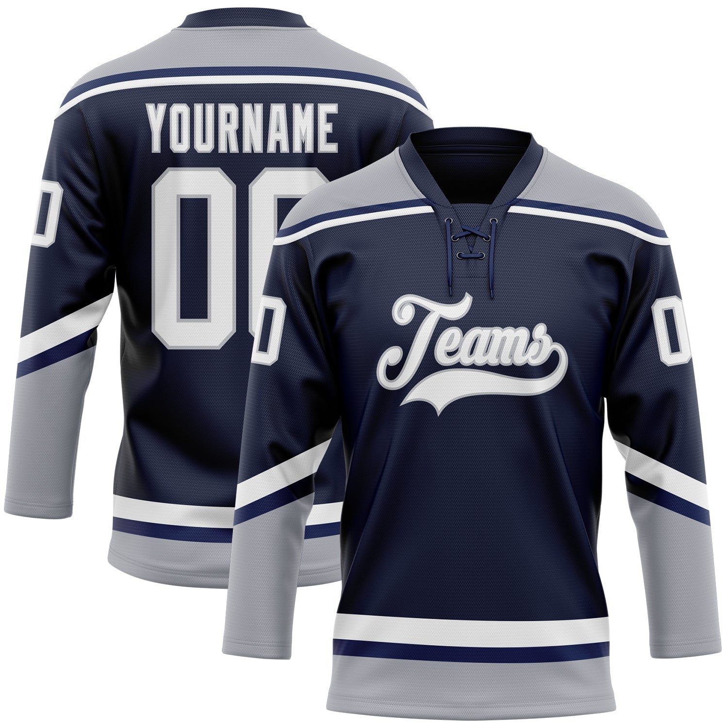 Custom Navy White-Gray Hockey Lace Neck Jersey