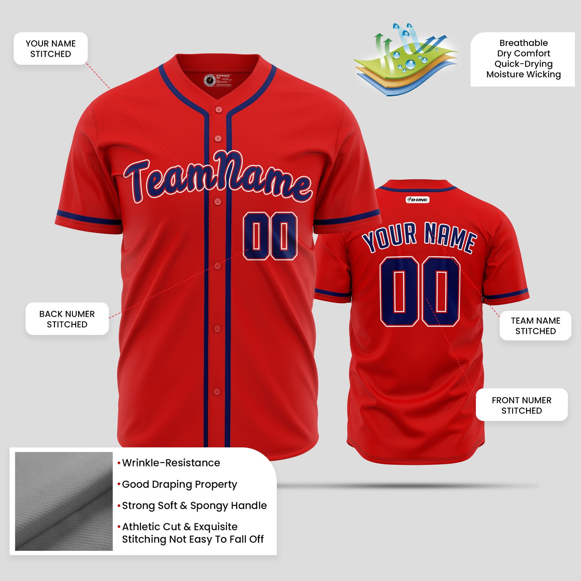 Perfect for teams that prioritize both style and functionality, the Custom Red & Blue Baseball Jersey is a must-have for game day. Buy online today and enjoy free shipping on your order!